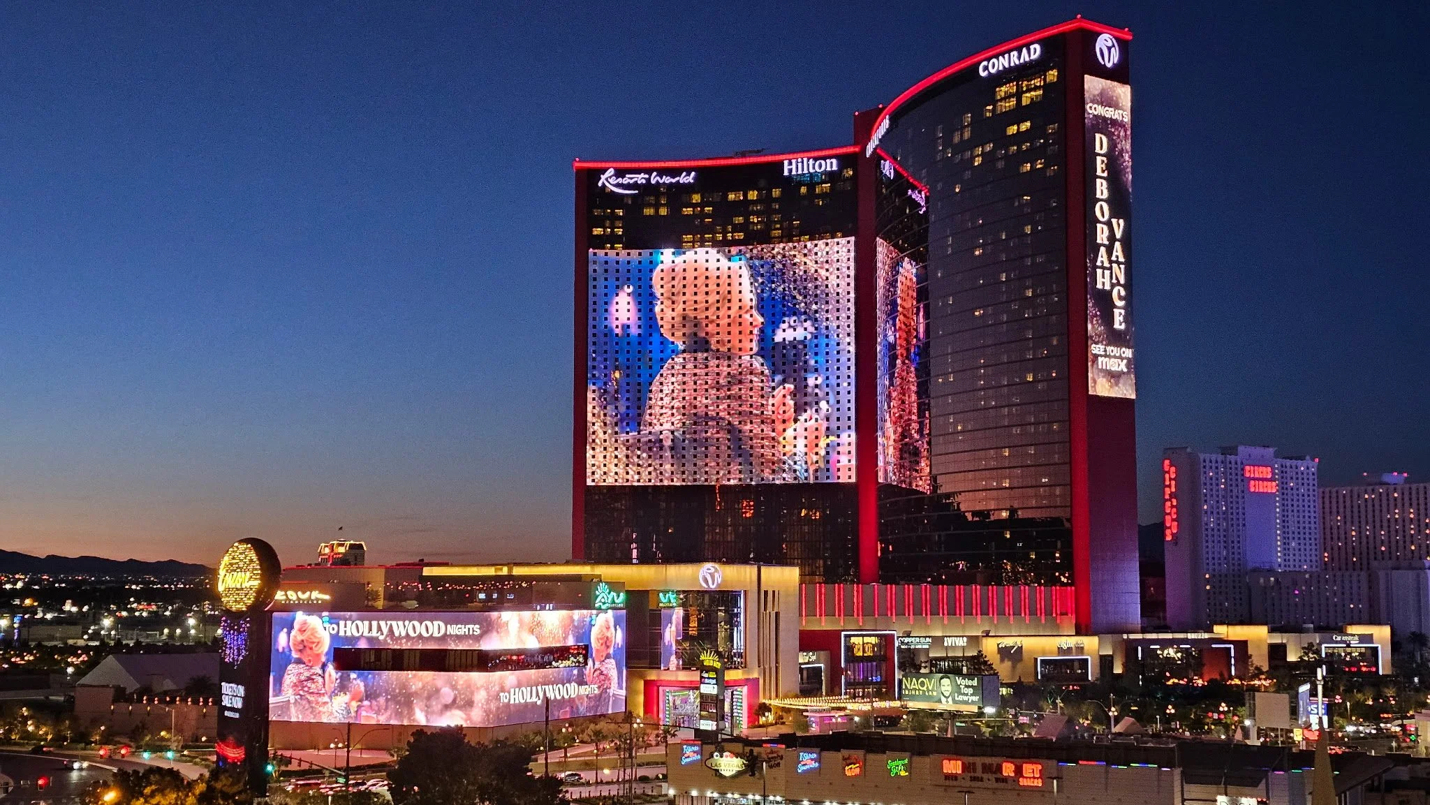 A massive, multi-screen takeover of the Resorts World Hotel in Las Vegas.